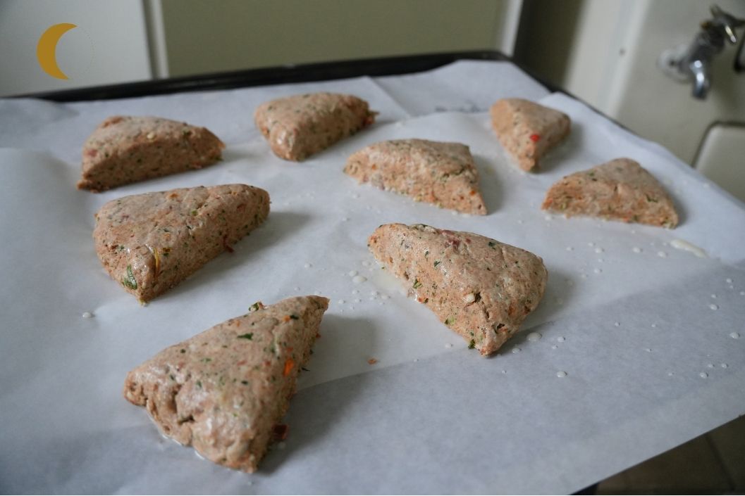 Flatten into a 3 cm thick round, cut into 8 wedges, and place on the baking sheet. Brush with extra milk.
