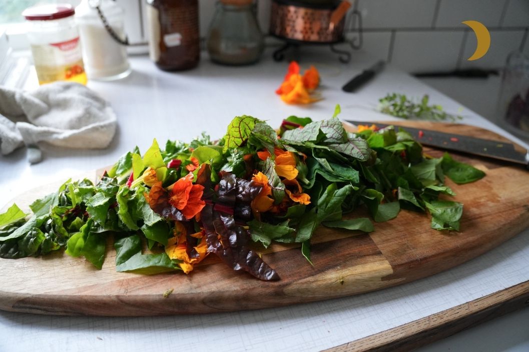 3 cups (or more) chopped garden /wild greens and edible flowers